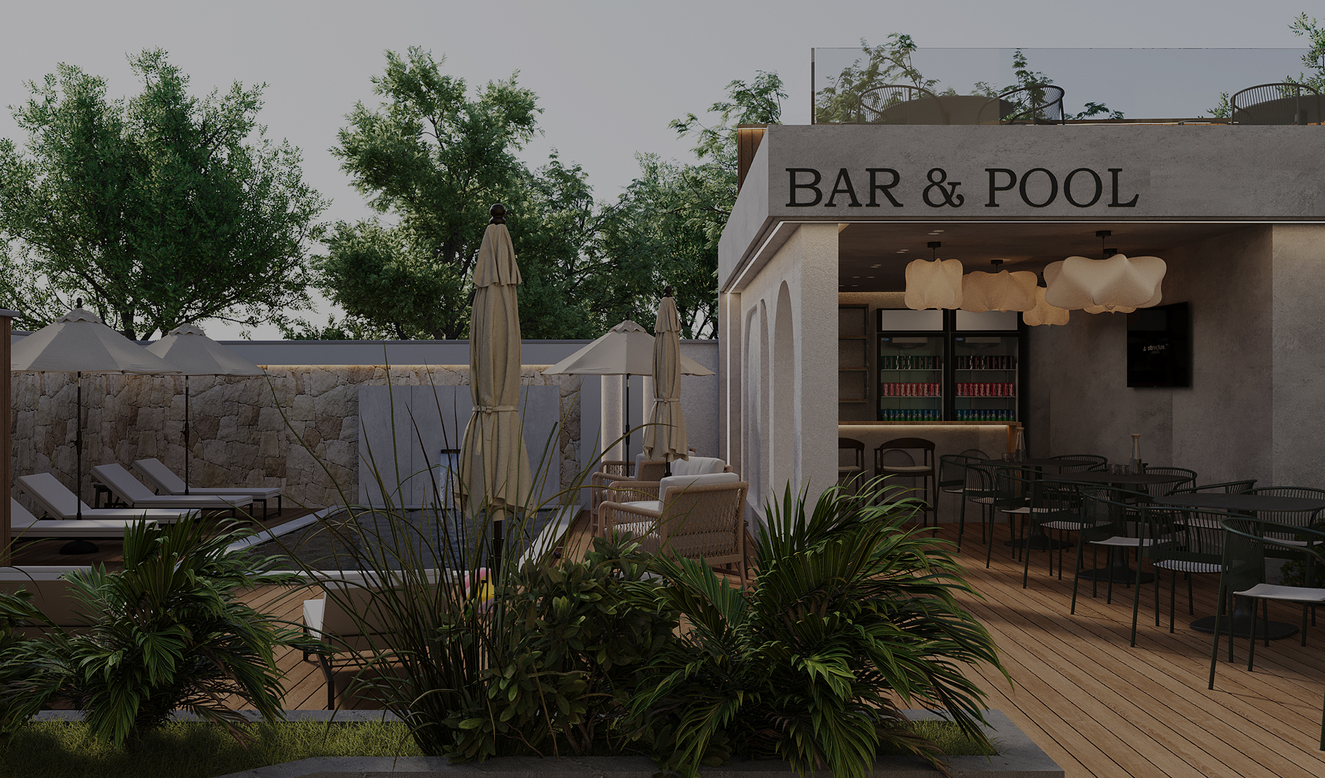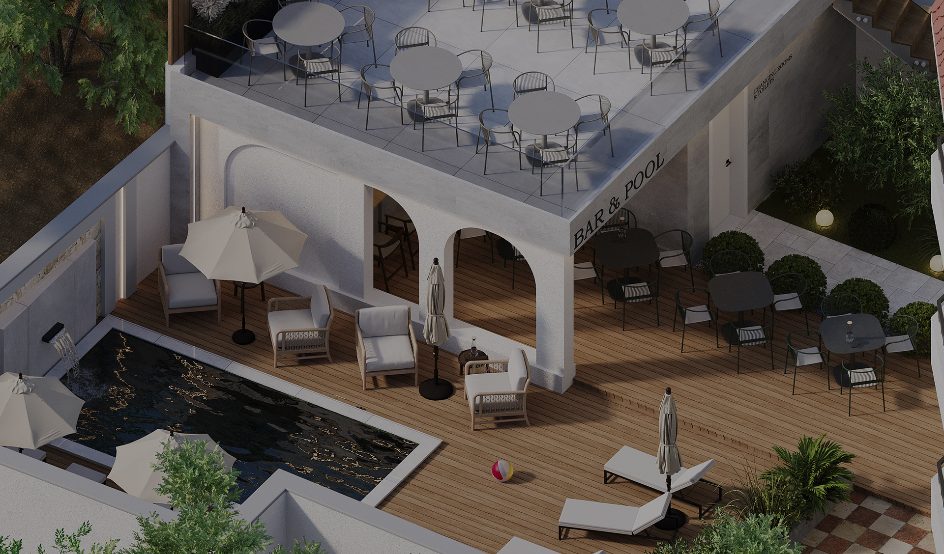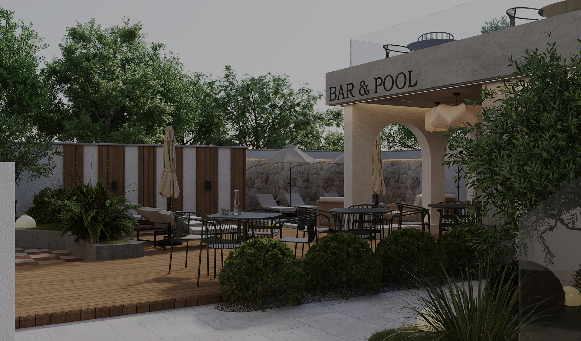 Një hapësirë relaksi dhe mikpritjeje, ku dizajni bashkon elementët natyralë me elegancën bashkëkohore. Projekti përfshin një tarracë me bar & pool zone, e menduar si një “oaz” urban që ofron qetësi dhe estetikë në çdo detaj.