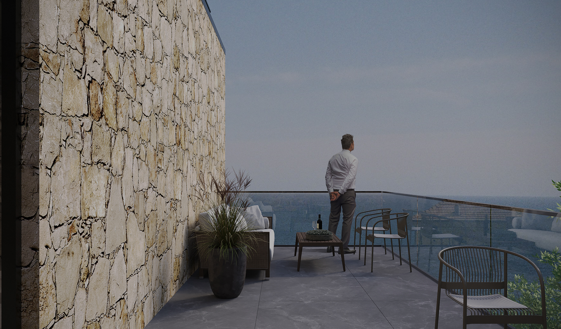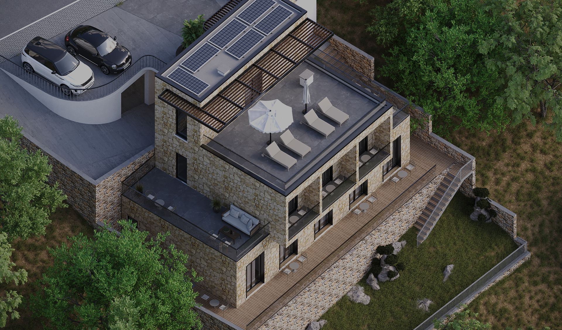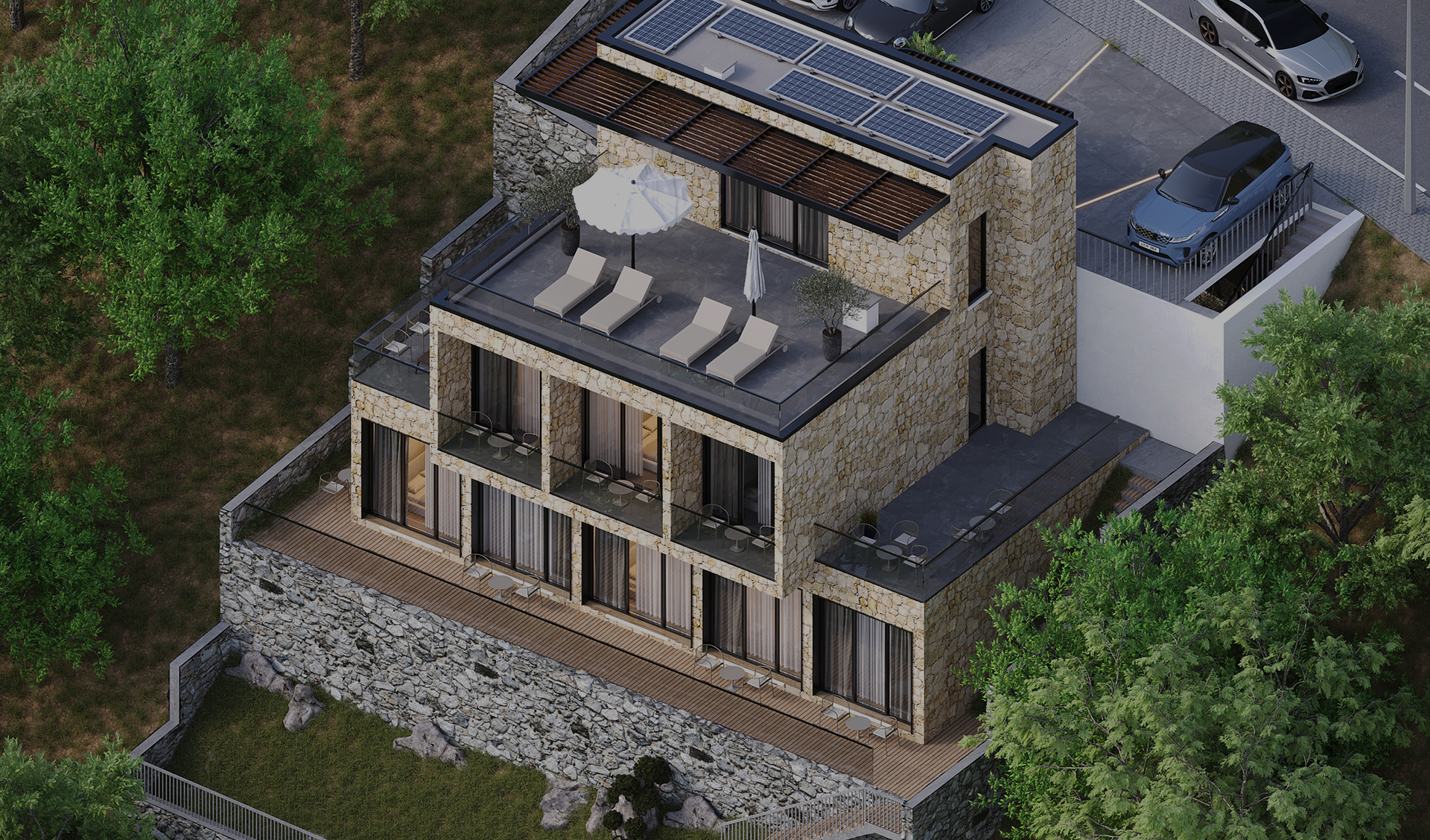 Volumet janë të fragmentuara dhe të adaptuara me pjerrësinë e tokës, duke krijuar tarraca të gjelbra, hapësira relaksi dhe pamje të pandërprera drejt horizontit. Përdorimi i gurit natyror në fasada kombinohet me linja moderne dhe elementë minimalistë, duke i dhënë objektit identitet të fortë, por njëkohësisht të integruar në mjedisin përreth.