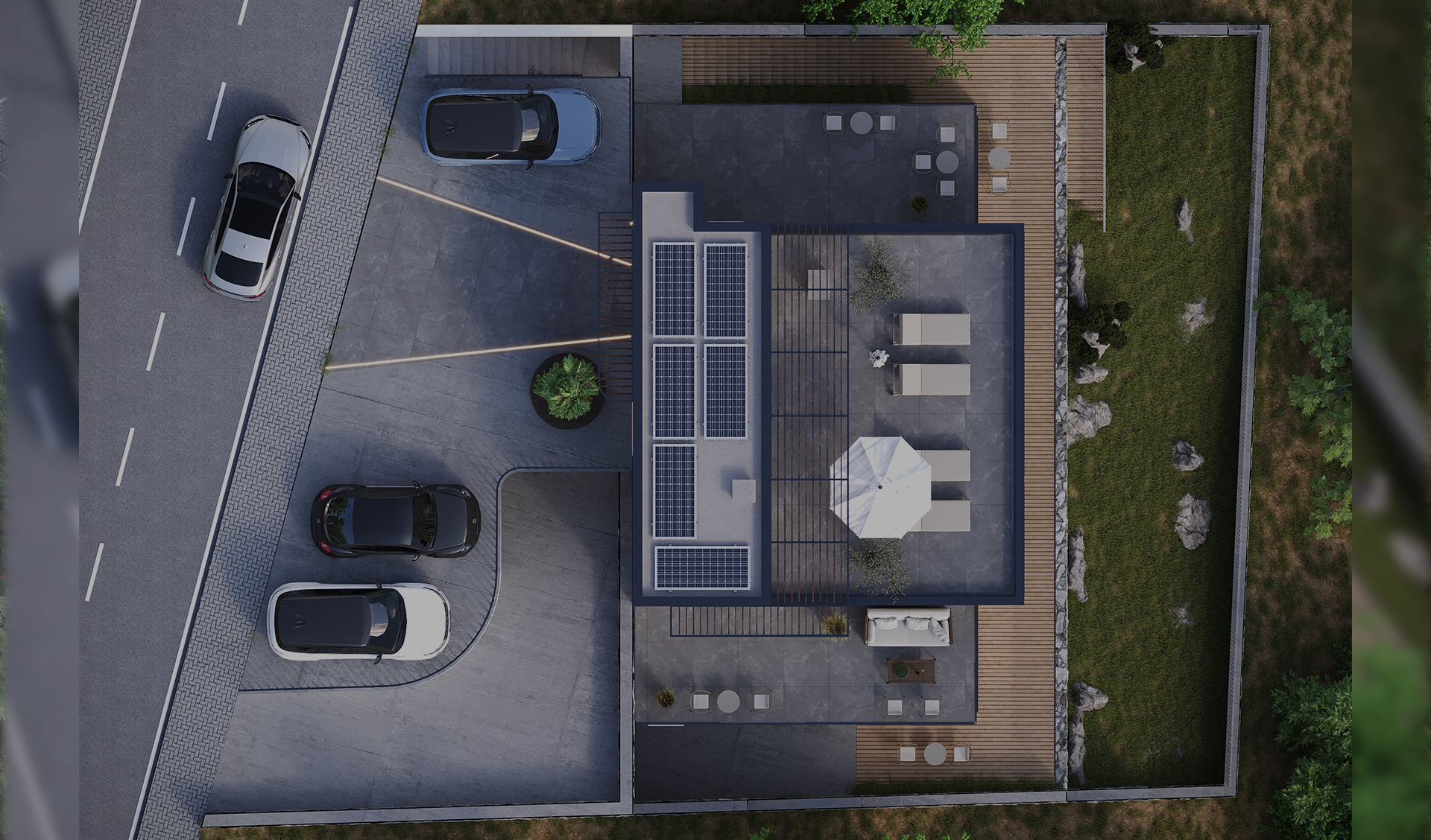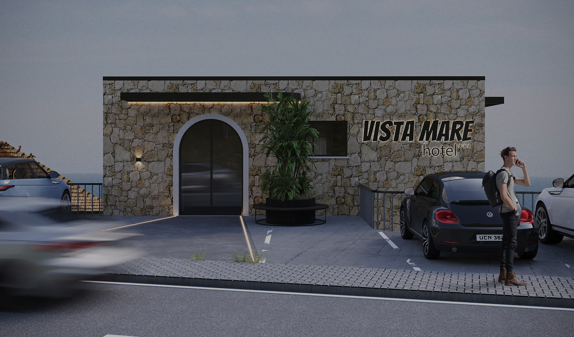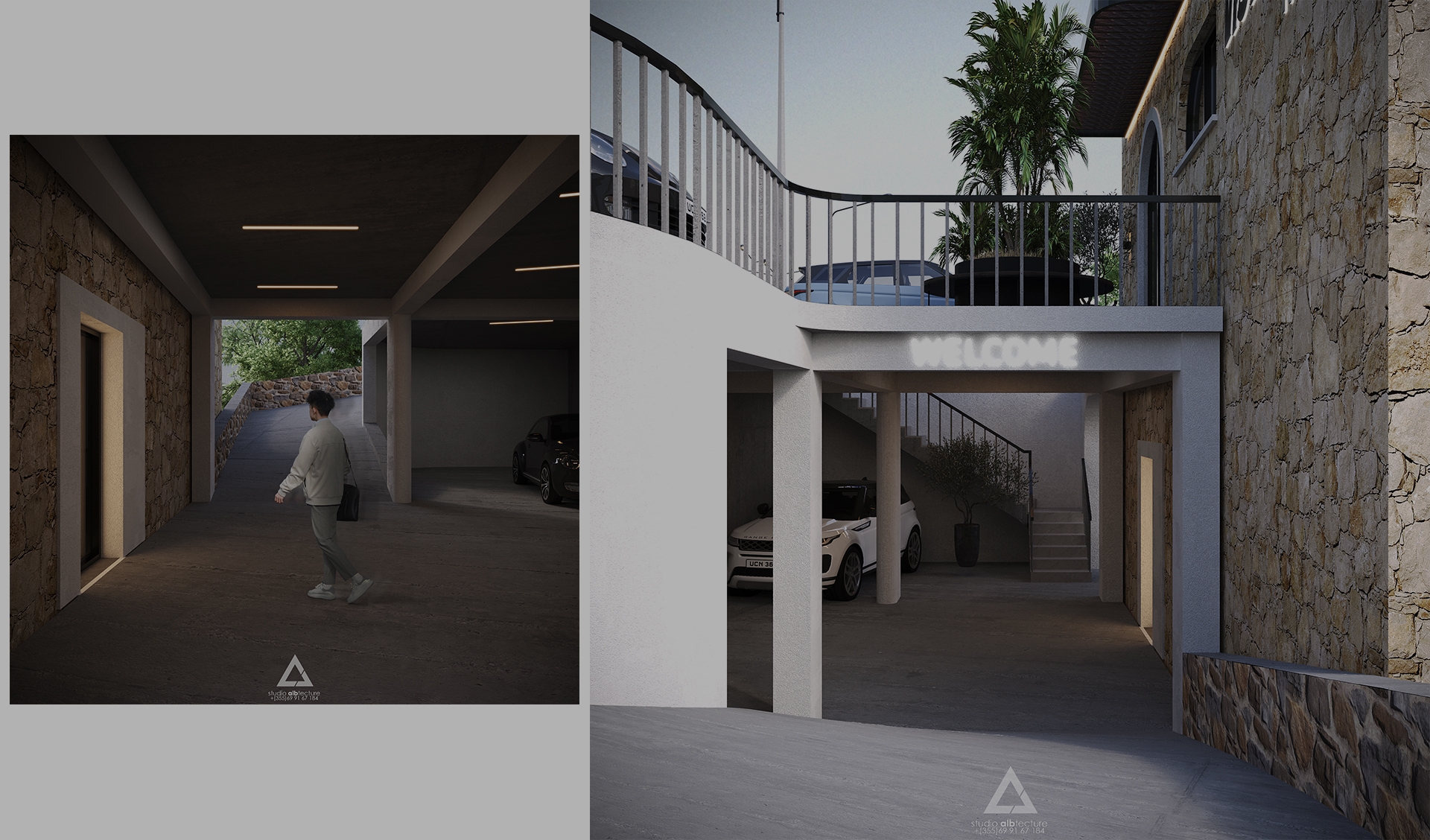 Volumet janë të fragmentuara dhe të adaptuara me pjerrësinë e tokës, duke krijuar tarraca të gjelbra, hapësira relaksi dhe pamje të pandërprera drejt horizontit. Përdorimi i gurit natyror në fasada kombinohet me linja moderne dhe elementë minimalistë, duke i dhënë objektit identitet të fortë, por njëkohësisht të integruar në mjedisin përreth.